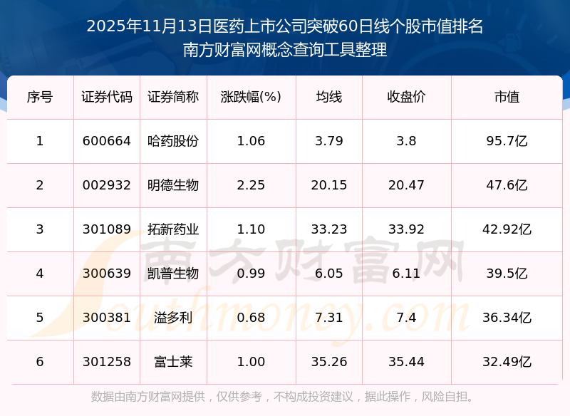 2025年11月13日醫(yī)藥上市公司突破60日線個(gè)股市值排名