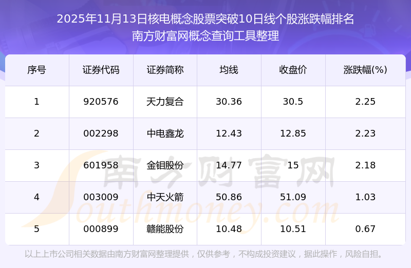2025年11月13日核電概念股票突破10日線個(gè)股漲跌幅排名
