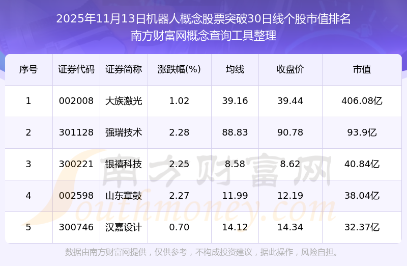2025年11月13日機(jī)器人概念股票突破30日線個(gè)股市值排名