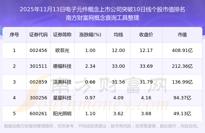 2025年11月13日電子元件概念上市公司突破10日線個(gè)股市值排名