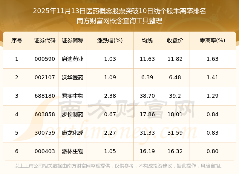 2025年11月13日醫(yī)藥概念股票突破10日線個(gè)股乖離率排名
