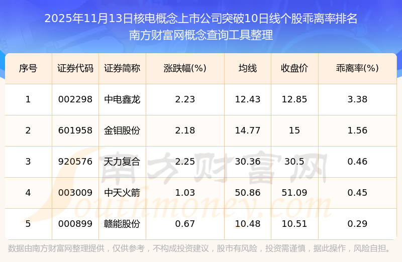 2025年11月13日核電概念上市公司突破10日線個(gè)股乖離率排名
