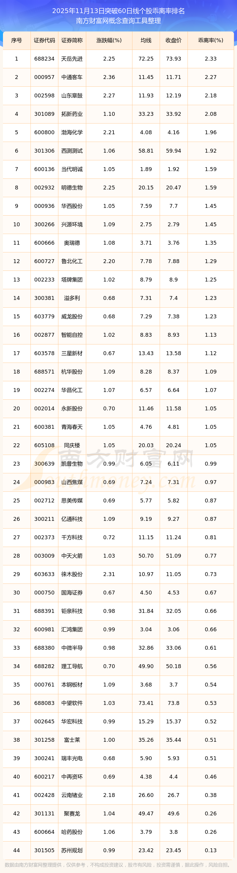 根據(jù)南方財富網(wǎng)概念查詢工具數(shù)據(jù)統(tǒng)計,截止2025年11月13日收盤,共有44只個股收盤價向上突破了60日線,其中乖離率較大的個股有天岳先進(jìn)、中通客車、山東章鼓、拓新藥業(yè)、渤海化學(xué)等,乖離率分別為2.33%、2.27%、2.18%、2.08%、1.96%。