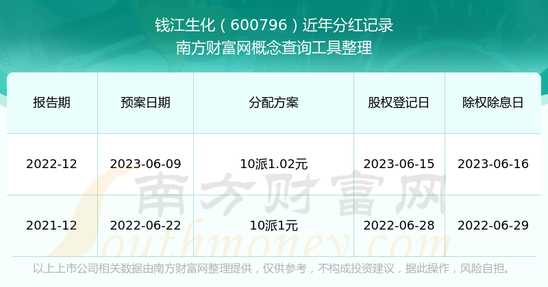 錢江生化最新一次公布的分紅方案為10派1.02元。本次權(quán)益分派股權(quán)登記日為2023年6月15日,除權(quán)除息日為2023年6月16日,派息日為2023年6月16日。