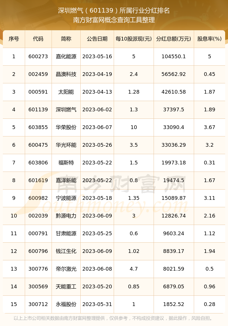 按照南方財富網(wǎng)趨勢選股系統(tǒng)統(tǒng)計,深圳燃氣所屬行業(yè)為天然氣行業(yè),天然氣行業(yè)分紅排名情況如下表: