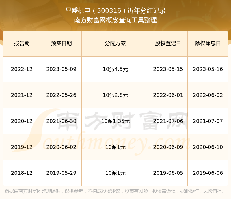 晶盛機電最新一次公布的分紅方案為10派4.5元。本次權(quán)益分派股權(quán)登記日為2023年5月15日,除權(quán)除息日為2023年5月16日,派息日為2023年5月16日。