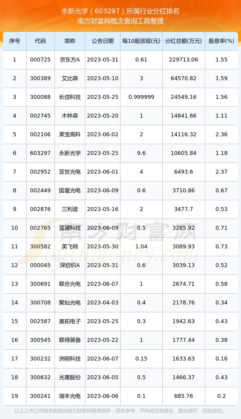 按照南方財(cái)富網(wǎng)趨勢選股系統(tǒng)統(tǒng)計(jì),永新光學(xué)所屬行業(yè)為光學(xué)光電子行業(yè),光學(xué)光電子行業(yè)分紅排名情況如下表: