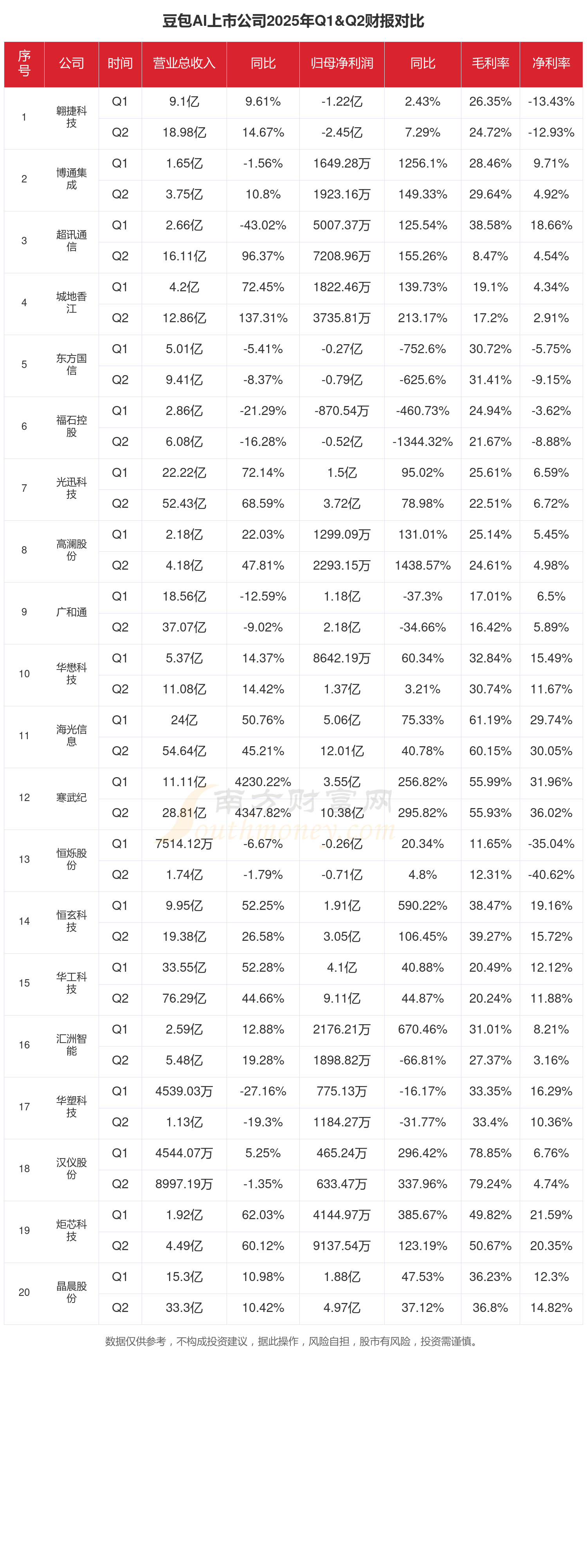 根據(jù)南方財富網(wǎng)概念查詢工具數(shù)據(jù)統(tǒng)計,A股51家豆包AI相關(guān)上市公司已發(fā)布2025年上半年財報。2025年上半年大家都過得怎么樣?一起來看看吧。