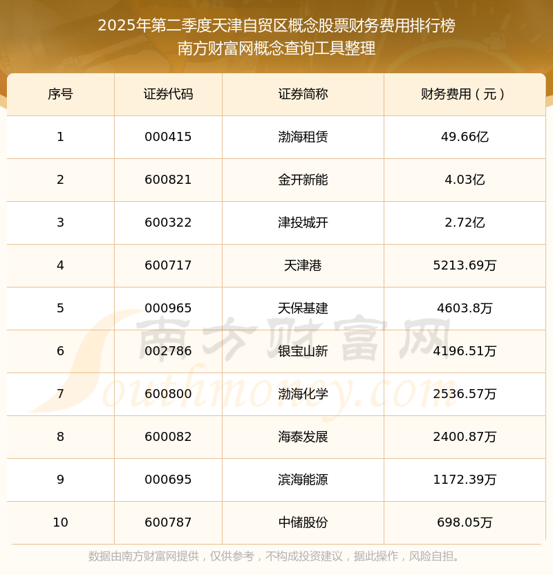 2025年第二季度,天津自貿(mào)區(qū)概念股票財(cái)務(wù)費(fèi)用排名如下:渤海租賃(000415)的財(cái)務(wù)費(fèi)用總額高達(dá)49.66億,金開(kāi)新能(600821)和津投城開(kāi)(600322)分別位居第二和第三,天津港(600717)、天;ǎ000965)、銀寶山新(002786)、渤;瘜W(xué)(600800)、海泰發(fā)展(600082)、濱海能源(000695)、中儲(chǔ)股份(600787)分別進(jìn)入前十,其財(cái)務(wù)費(fèi)用總額分別排名第4-10名。