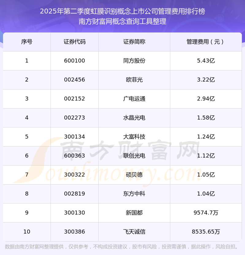 2025年第二季度,虹膜識別概念上市公司管理費用排名如下:同方股份(600100)的管理費用總額高達5.43億,歐菲光(002456)和廣電運通(002152)位居第二和第三,水晶光電(002273)、大富科技(300134)、聯(lián)創(chuàng)光電(600363)、碩貝德(300322)、東方中科(002819)、新國都(300130)、飛天誠信(300386)分別進入前十,其管理費用總額分別排名第4-10名。