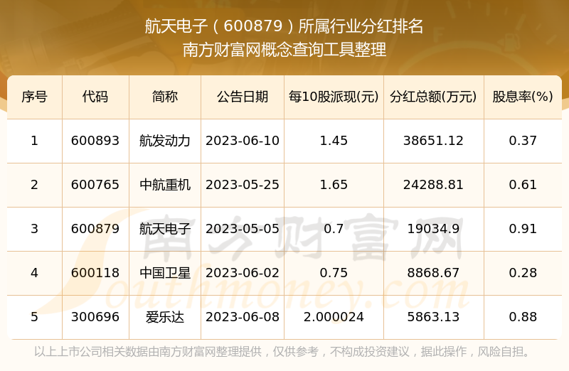 按照南方財富網(wǎng)趨勢選股系統(tǒng)統(tǒng)計,航天電子所屬行業(yè)為航天航空行業(yè),航天航空行業(yè)分紅排名情況如下表: