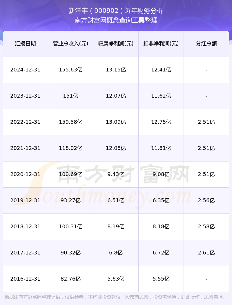 2024年報(bào)顯示,新洋豐實(shí)現(xiàn)營(yíng)收155.63億,同比增長(zhǎng)3.07%;凈利潤(rùn)13.15億,同比增長(zhǎng)8.99%;毛利率15.64%。