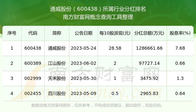 按照南方財富網(wǎng)趨勢選股系統(tǒng)統(tǒng)計,通威股份所屬行業(yè)為太陽能電池行業(yè),太陽能電池行業(yè)分紅排名情況如下表: