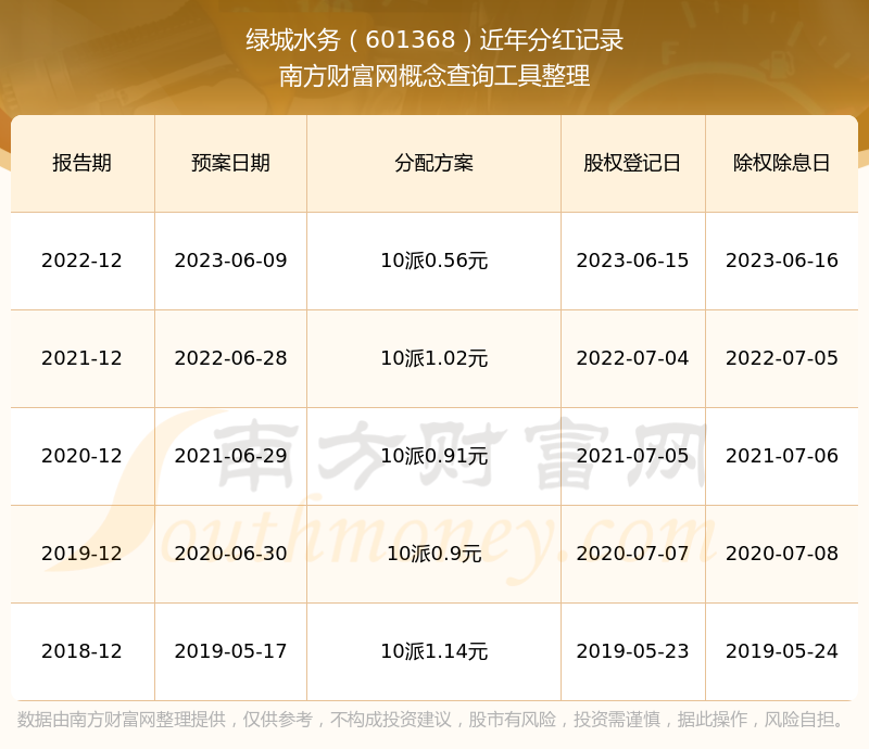 綠城水務(wù)最新一次公布的分紅方案為10派0.56元。本次權(quán)益分派股權(quán)登記日為2023年6月15日,除權(quán)除息日為2023年6月16日,派息日為2023年6月16日。