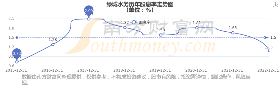近年綠城水務(wù)年度股息率走勢如下圖: