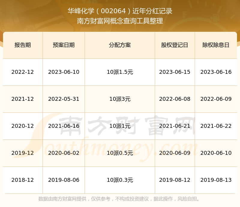 華峰化學最新一次公布的分紅方案為10派1.5元。本次權(quán)益分派股權(quán)登記日為2023年6月15日,除權(quán)除息日為2023年6月16日,派息日為2023年6月16日。