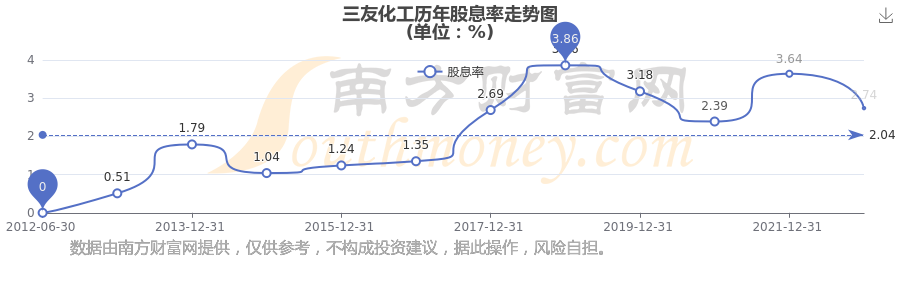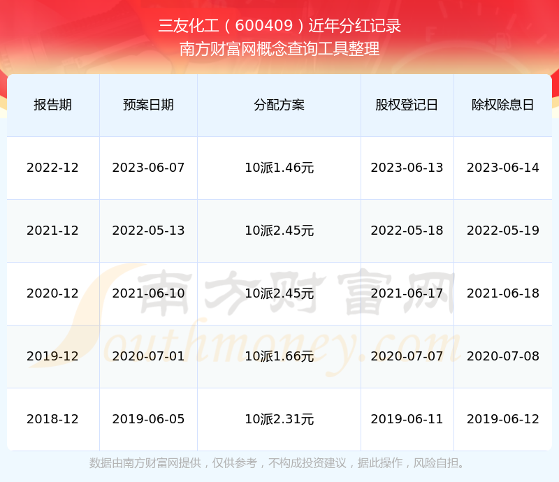三友化工最新一次公布的分紅方案為10派1.46元。本次權(quán)益分派股權(quán)登記日為2023年6月13日,除權(quán)除息日為2023年6月14日,派息日為2023年6月14日。