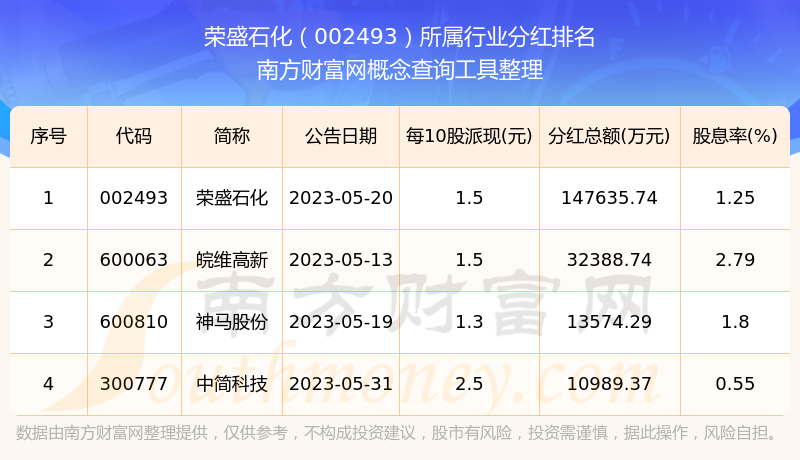 按照南方財富網(wǎng)趨勢選股系統(tǒng)統(tǒng)計,榮盛石化所屬行業(yè)為化纖行業(yè)行業(yè),化纖行業(yè)行業(yè)分紅排名情況如下表: