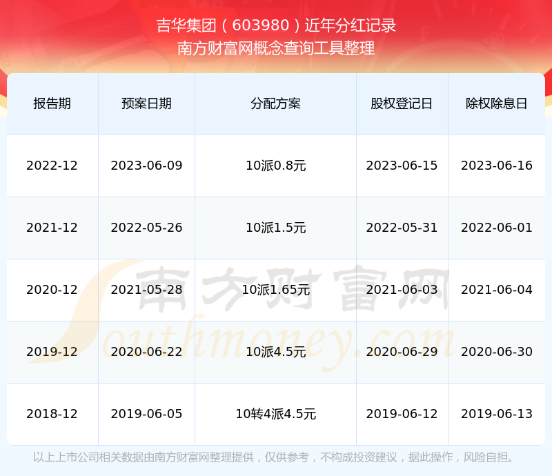 吉華集團(tuán)最新一次公布的分紅方案為10派0.8元。本次權(quán)益分派股權(quán)登記日為2023年6月15日,除權(quán)除息日為2023年6月16日,派息日為2023年6月16日。