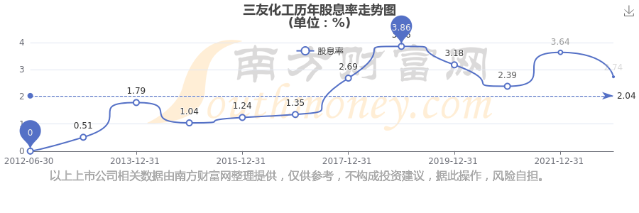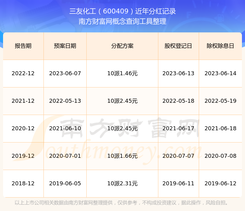 三友化工最新一次公布的分紅方案為10派1.46元。本次權(quán)益分派股權(quán)登記日為2023年6月13日,除權(quán)除息日為2023年6月14日,派息日為2023年6月14日。