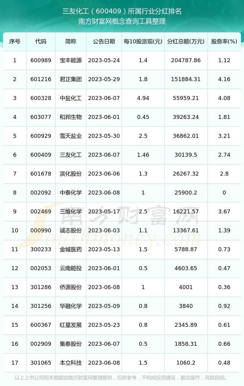 按照南方財富網(wǎng)趨勢選股系統(tǒng)統(tǒng)計,三友化工所屬行業(yè)為粘膠短纖行業(yè),粘膠短纖行業(yè)分紅排名情況如下表: