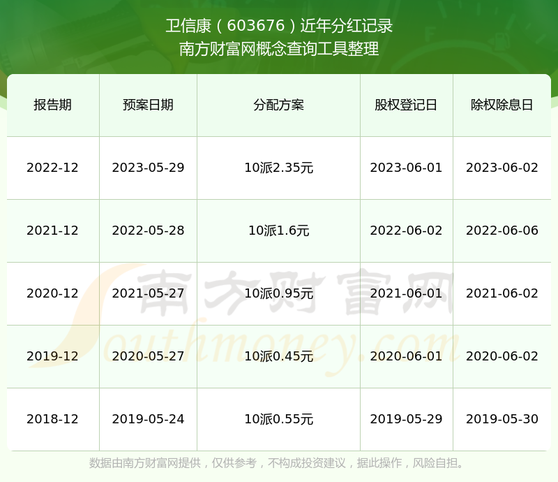 衛(wèi)信康最新一次公布的分紅方案為10派2.35元。本次權(quán)益分派股權(quán)登記日為2023年6月1日,除權(quán)除息日為2023年6月2日,派息日為2023年6月2日。