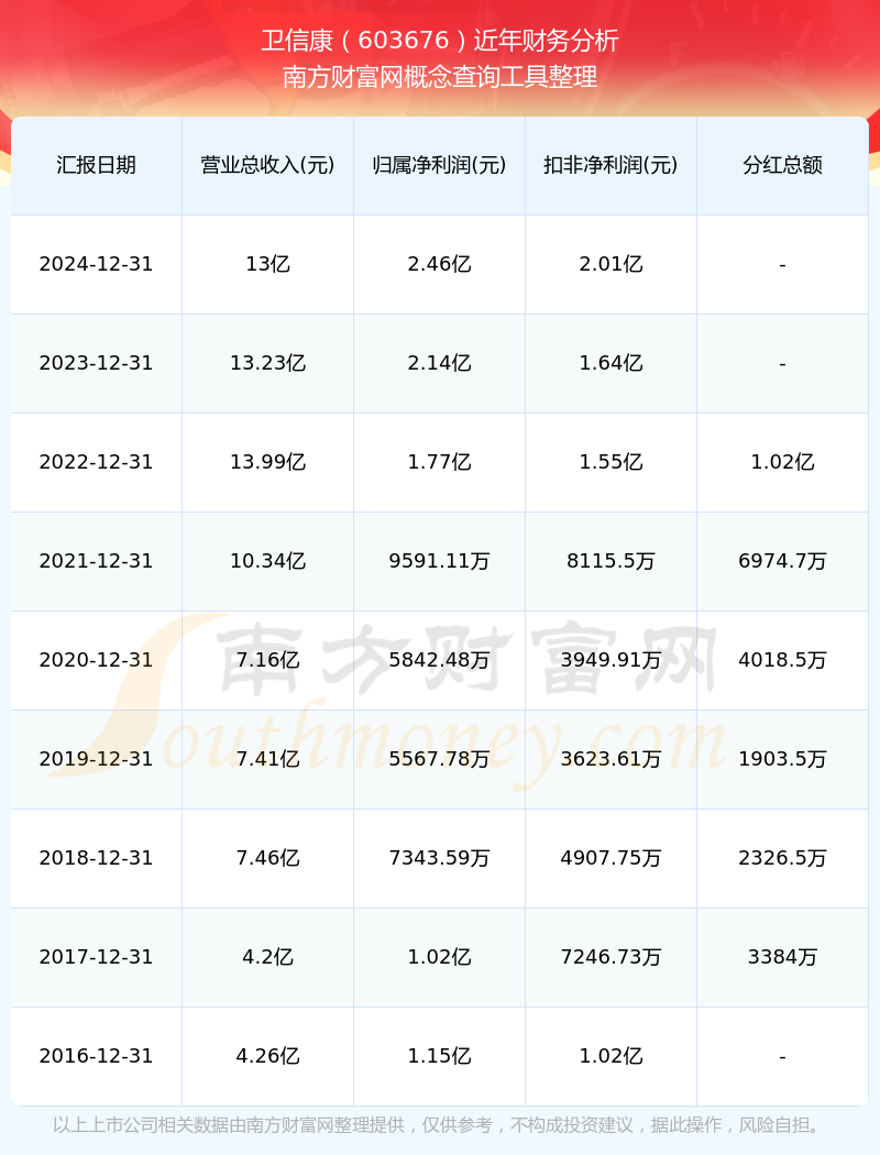 衛(wèi)信康公司2024年實(shí)現(xiàn)營(yíng)業(yè)收入13億元,同比增長(zhǎng)-1.69%;凈利潤(rùn)2.46億元,同比增長(zhǎng)15.02%;毛利率54.24%。