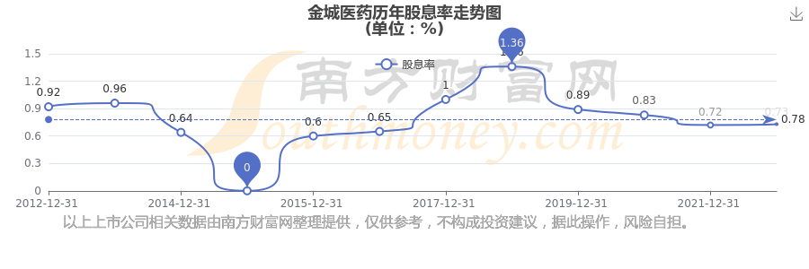 近年金城醫(yī)藥年度股息率走勢如下圖: