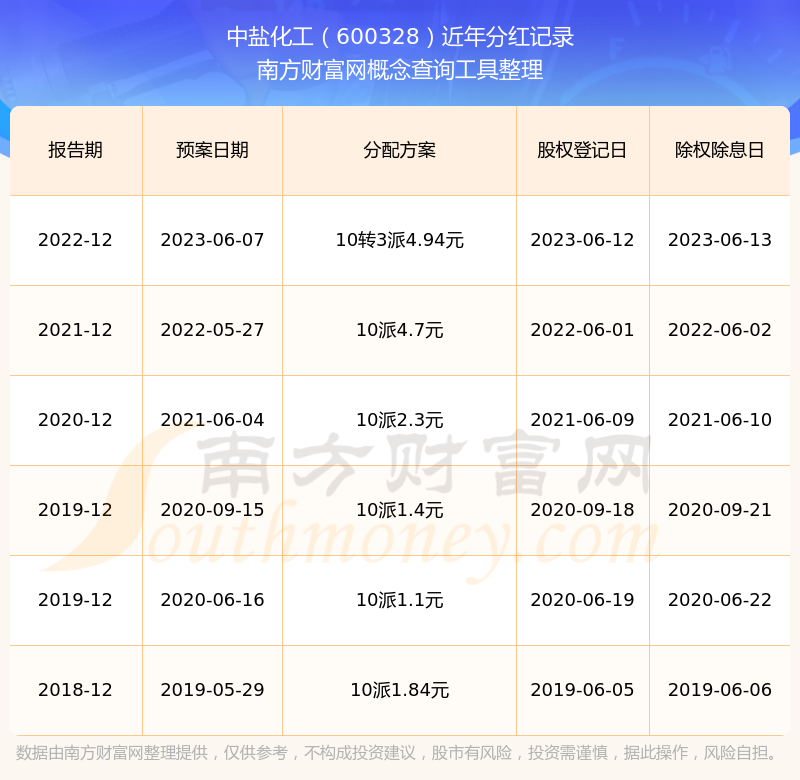 按照南方財富網(wǎng)趨勢選股系統(tǒng)統(tǒng)計,中鹽化工所屬行業(yè)為鹽化工行業(yè),鹽化工行業(yè)分紅排名情況如下表: