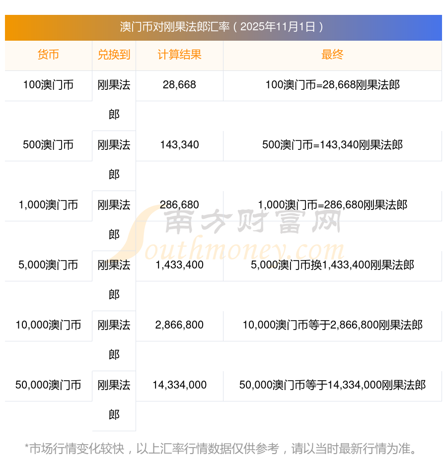 今日匯率行情 澳門(mén)幣與剛果法郎兌換匯率是多少11-01