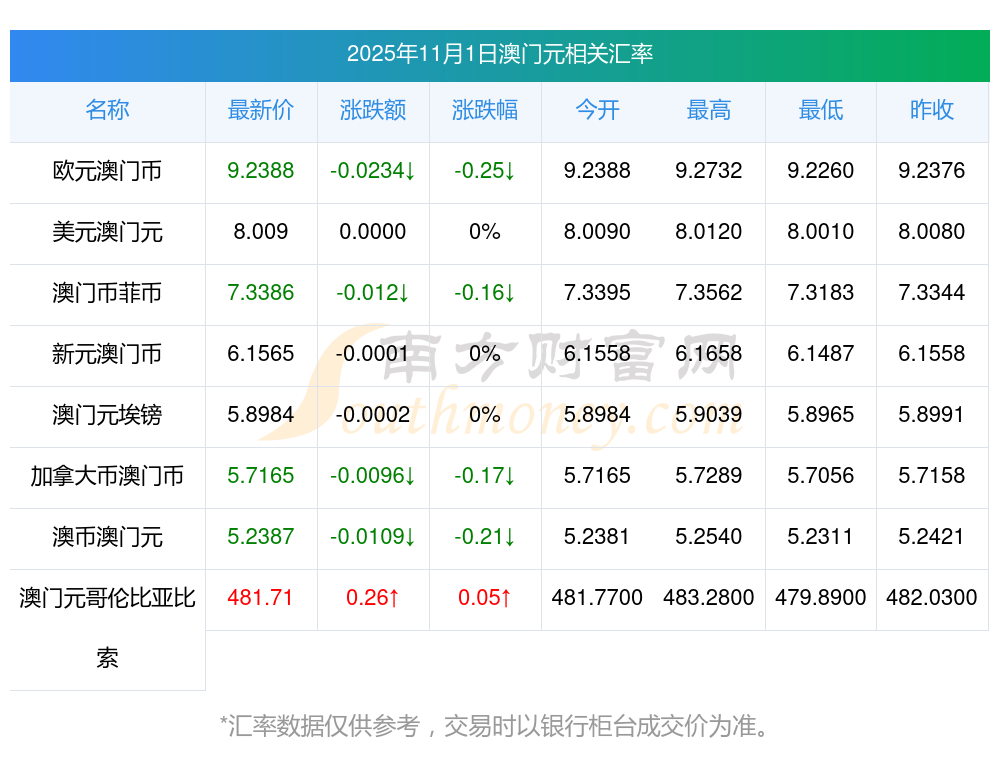 2025年11月1日澳門元相關(guān)匯率查詢