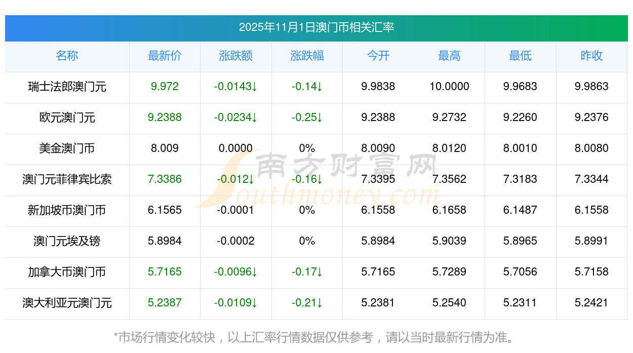 2025年11月1日澳門幣相關(guān)匯率查詢