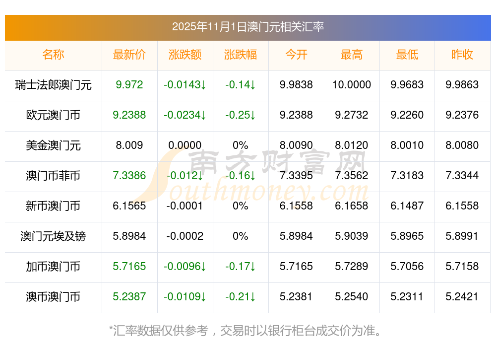 2025年11月1日澳門元相關(guān)匯率查詢