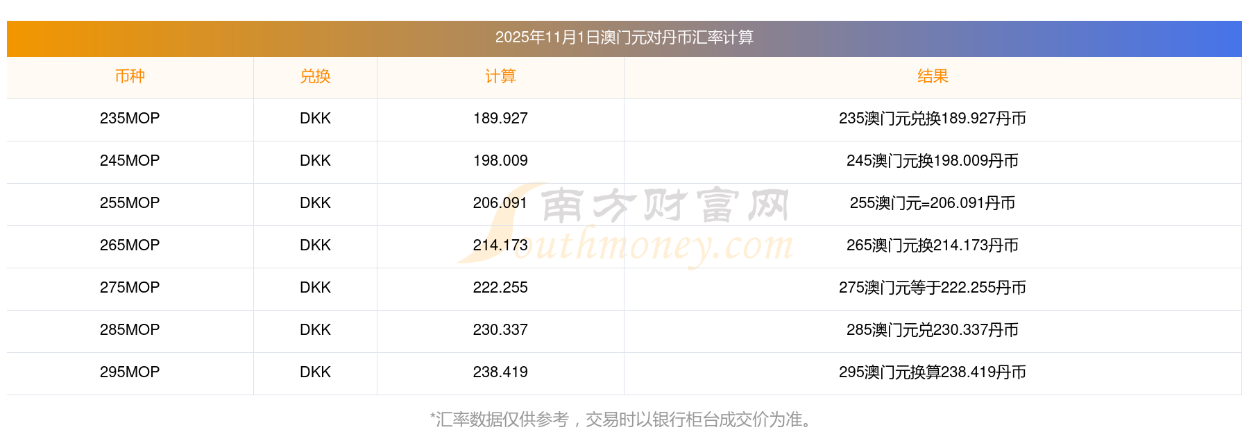 新匯率,今日澳門元對(duì)丹幣匯率多少?2025-11-01