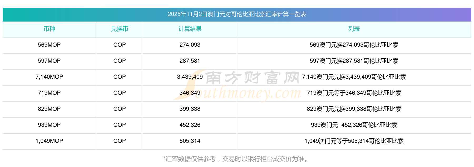 南方財(cái)富網(wǎng)為您提供澳門元對(duì)哥倫比亞比索匯率最新價(jià)格詳情。