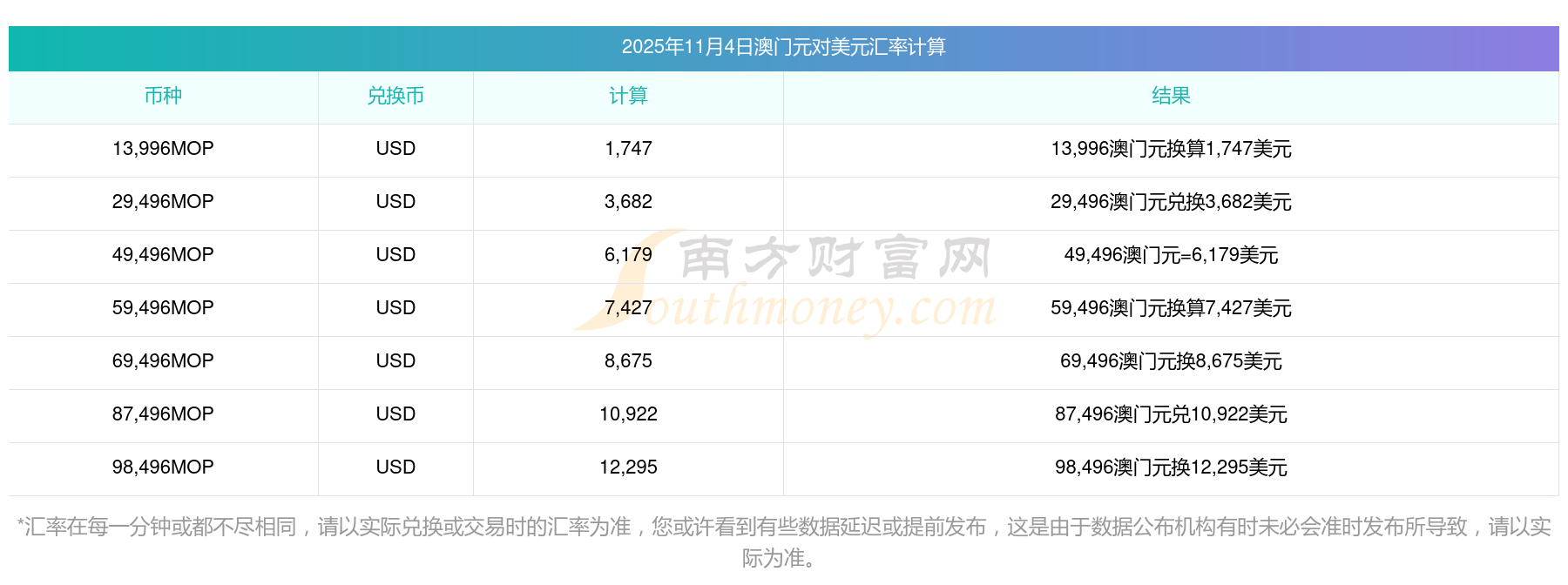 2025年11月4日匯率行情:50澳門元對美元匯率多少