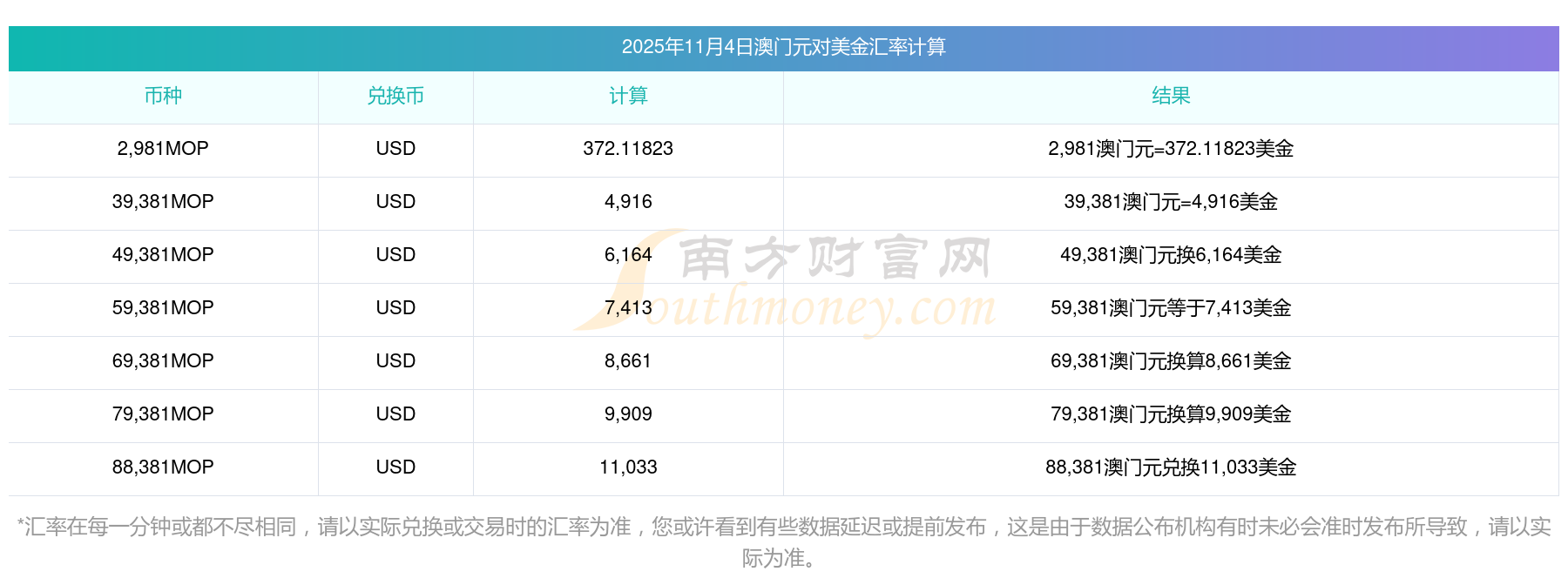 2025年11月4日匯率行情:34澳門元對美金匯率多少
