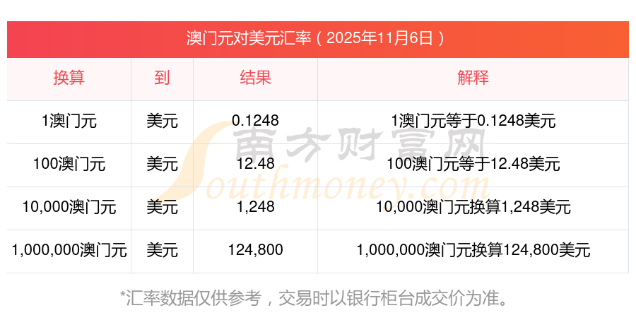 2025年11月6日匯率行情:42澳門元對美元匯率多少