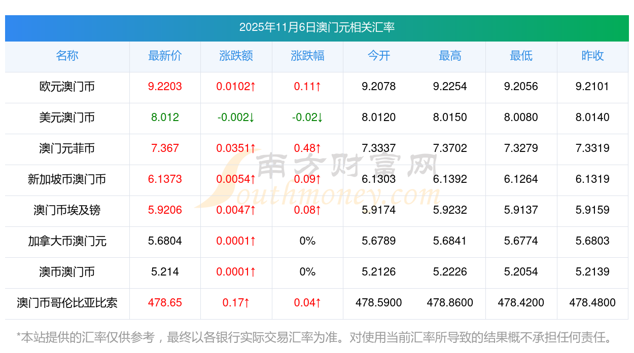2025年11月6日澳門(mén)元相關(guān)匯率查詢