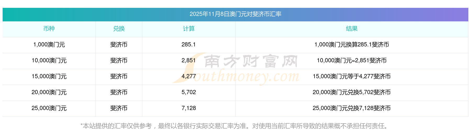 南方財(cái)富網(wǎng)為您提供澳門元對斐濟(jì)幣匯率最新價格詳情。
