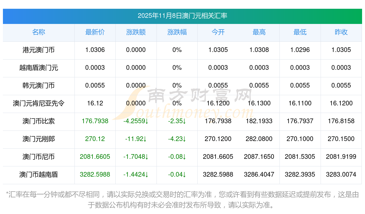 根據(jù)2025年11月8日匯率,澳門元兌換斐濟幣匯率最新價0.285100,今開價0.2851,昨收價0.2851,最高價0.2884,最低價0.2849。