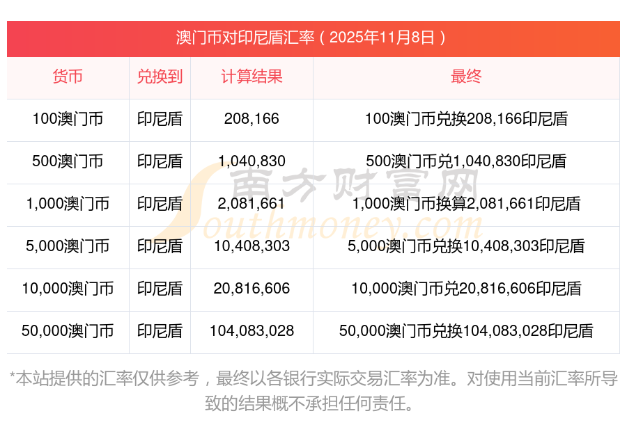 南方財(cái)富網(wǎng)為您提供澳門幣對印尼盾匯率最新價(jià)格詳情。