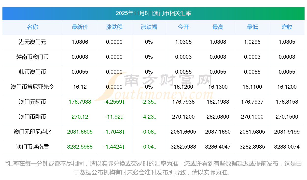2025年11月8日澳門(mén)幣相關(guān)匯率查詢(xún)
