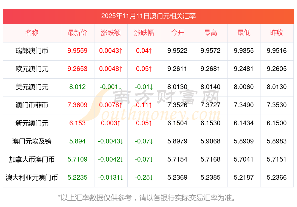 2025年11月11日澳門元相關(guān)匯率查詢