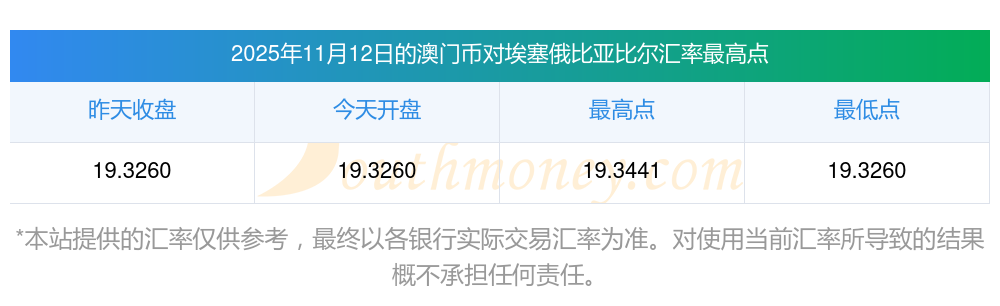 最新2025年11月12日澳門幣兌換埃塞俄比亞比爾匯率是:19.3429
