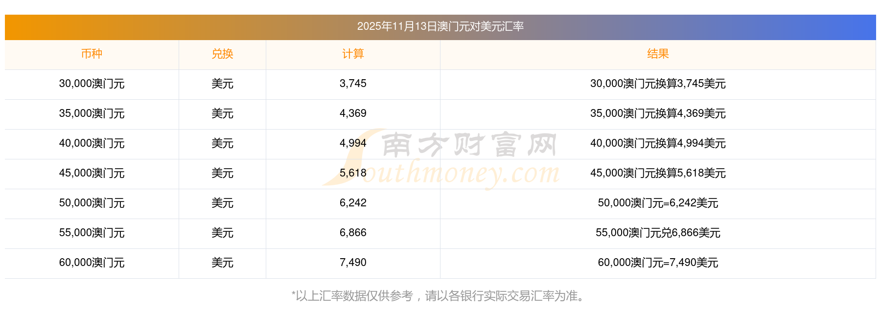 2025年11月13日匯率行情:45澳門元對美元匯率多少