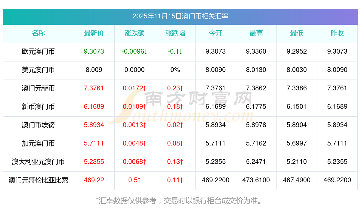 2025年11月15日澳門(mén)幣相關(guān)匯率查詢