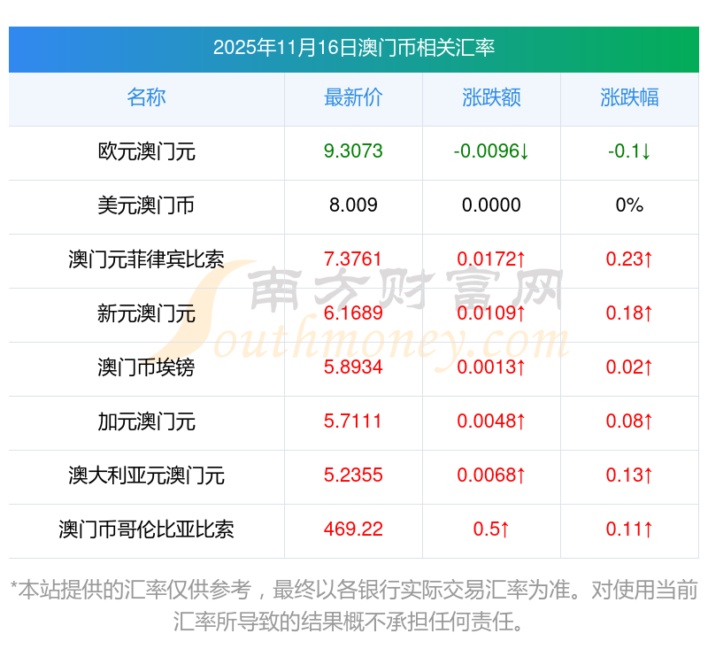 2025年11月16日澳門幣相關(guān)匯率查詢