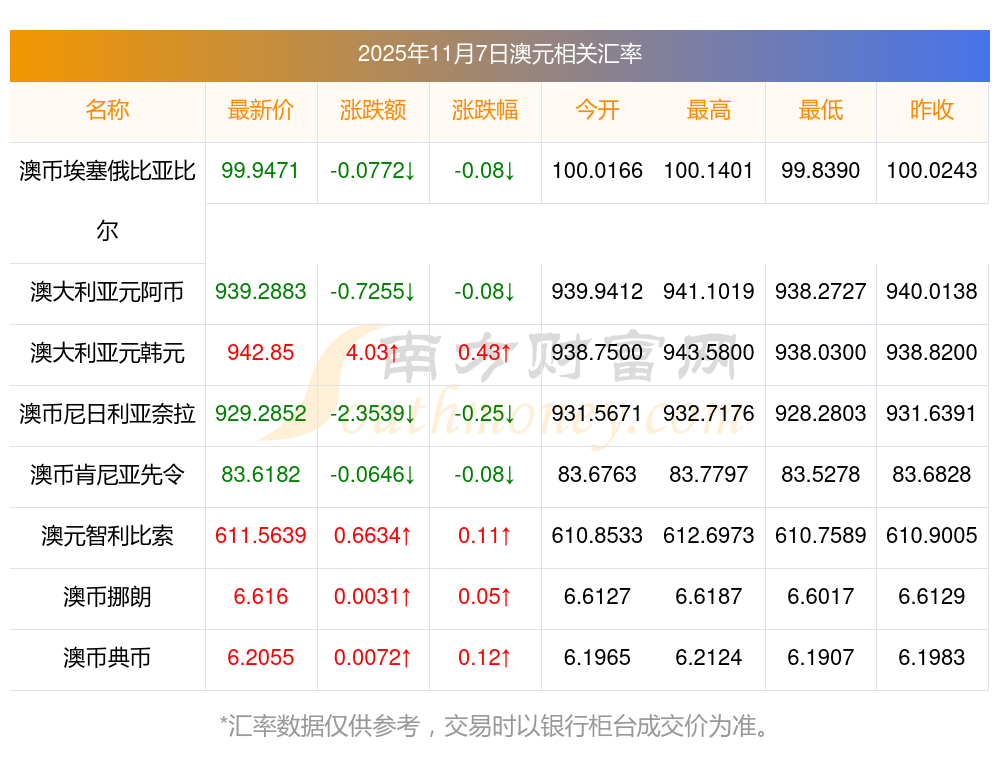 2025年11月7日最新消息,澳元兌換人民幣最新匯率為4.611800,今開為4.6127,昨收為4.6130,最高為4.6184,最低為4.6067。
