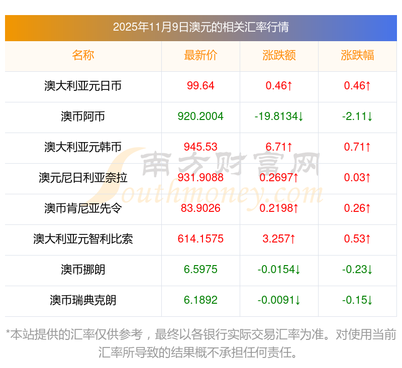 根據(jù)2025年11月9日匯率,澳元兌換澳門幣匯率最新5.205000,今開5.2050,昨收5.2050,最高5.2094,最低5.1816。